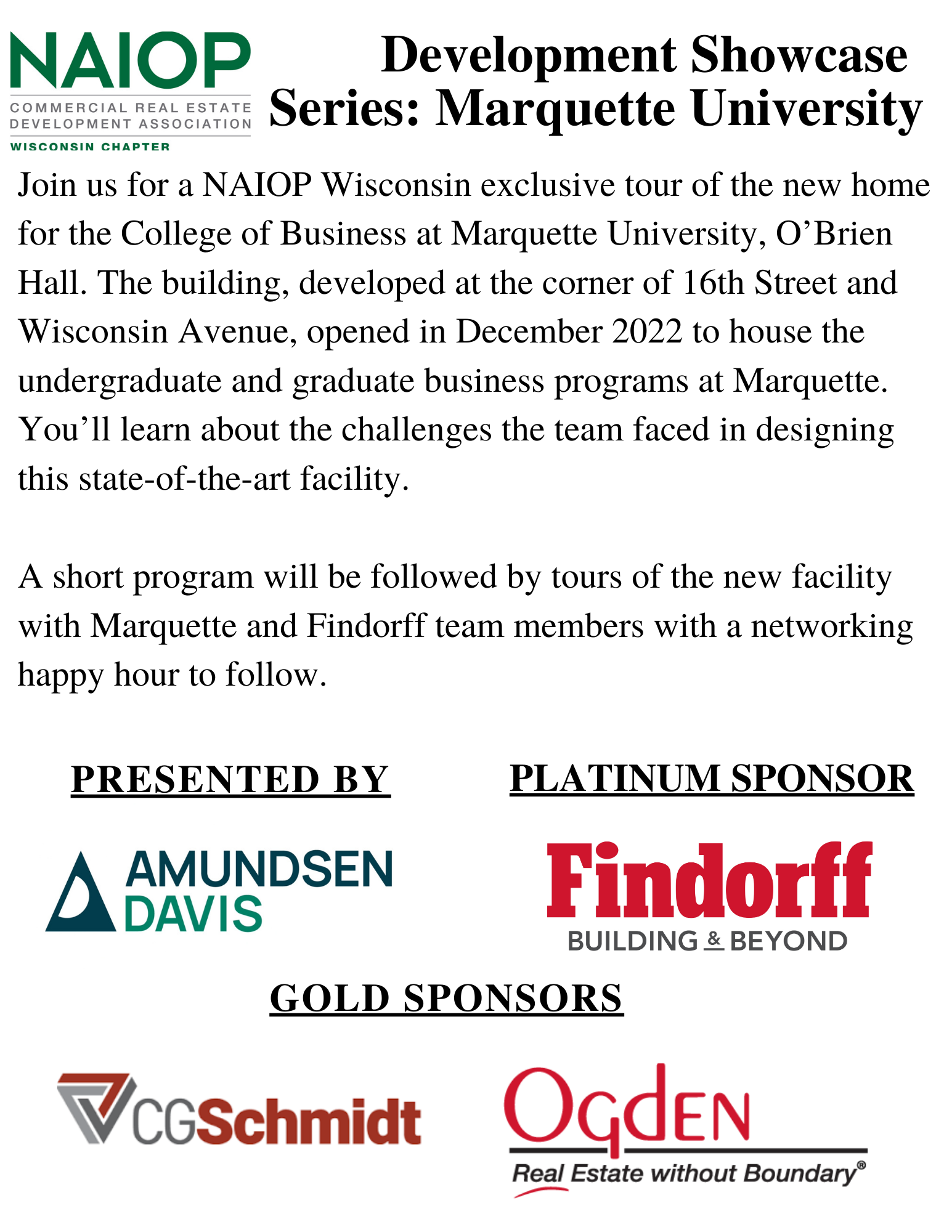 Join us for a NAIOP Wisconsin exclusive tour of the new home for the College of Business at Marquette University, O’Brien Hall. The building, developed at the corner of 16th Street and Wisconsin Avenue, opened in December 2022 to house the undergraduate and graduate business programs at Marquette. You’ll learn about the challenges the team faced in designing this state-of-the-art facility, including:
